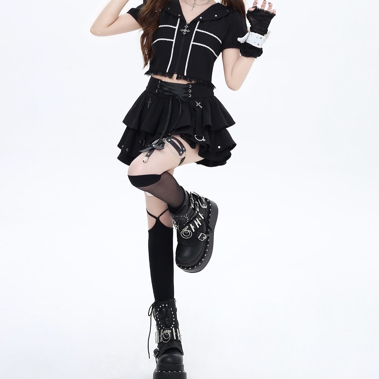 コルセット風のリボンとクロスがアクセントのミニスカートです。